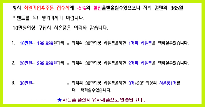 365ÀÏ Ç׽à 10¸¸ÀÌ»ó ±Ý¾×º° »çÀºÇ° À̺¥Æ®¿Í -5%(ȸ¿ø°¡ÀÔÈÄ ÁÖ¹®¼ ÀÛ¼º½Ã)